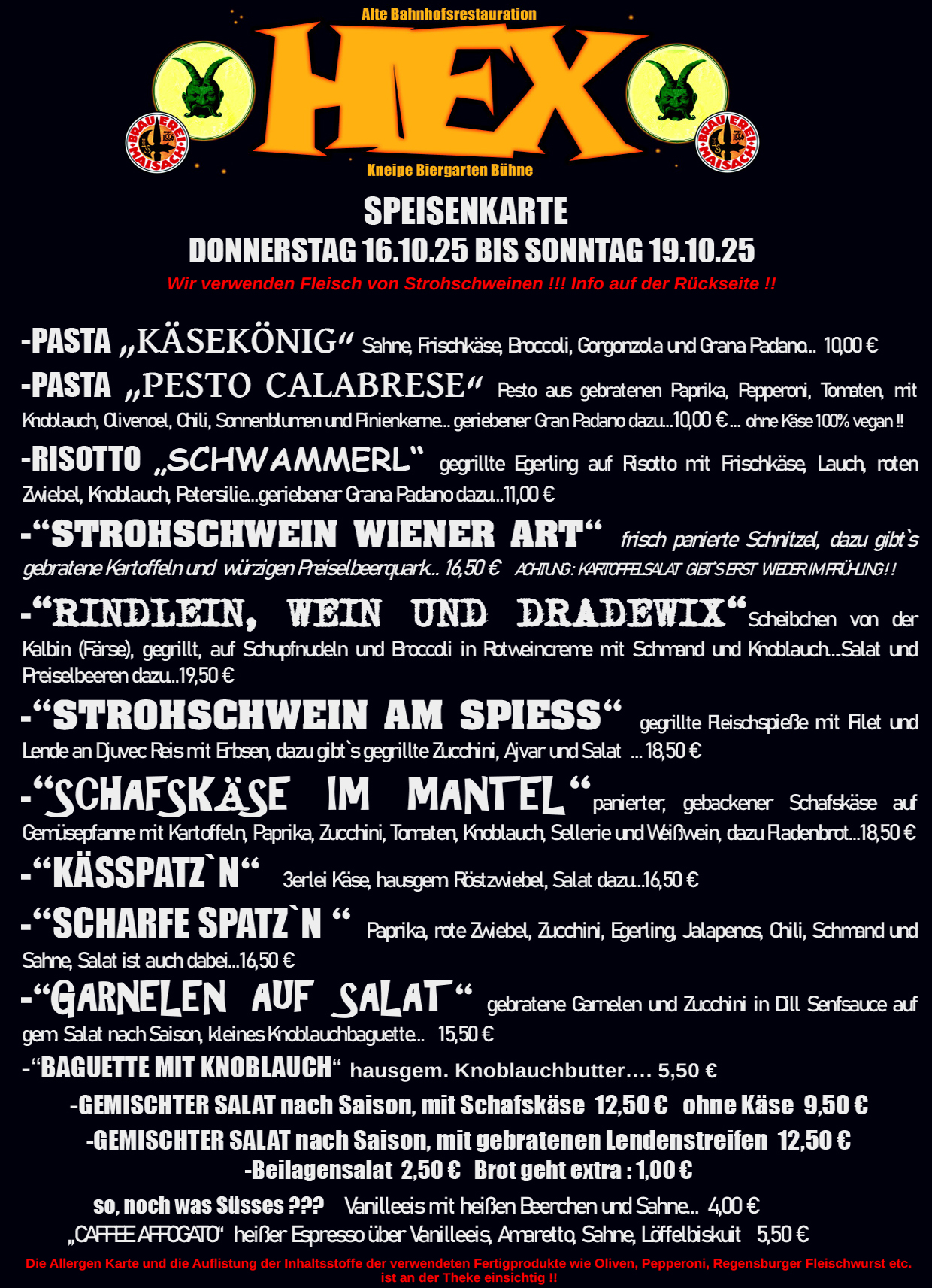 AUßERDEM KEIN FACEBOOK, KEIN X, KEIN TIKTOK, KEIN WHAT`S APP, KEIN INSTA….UND DIE HEX IST KEIN RESTAURANT, SONDERN „NUR“ EINE KNEIPE, IN DER GANZ ORDENTLICH GEKOCHT WIRD…UND „BLOß SCHNELL WAS ESSEN“ GEHT GAR NICHT…