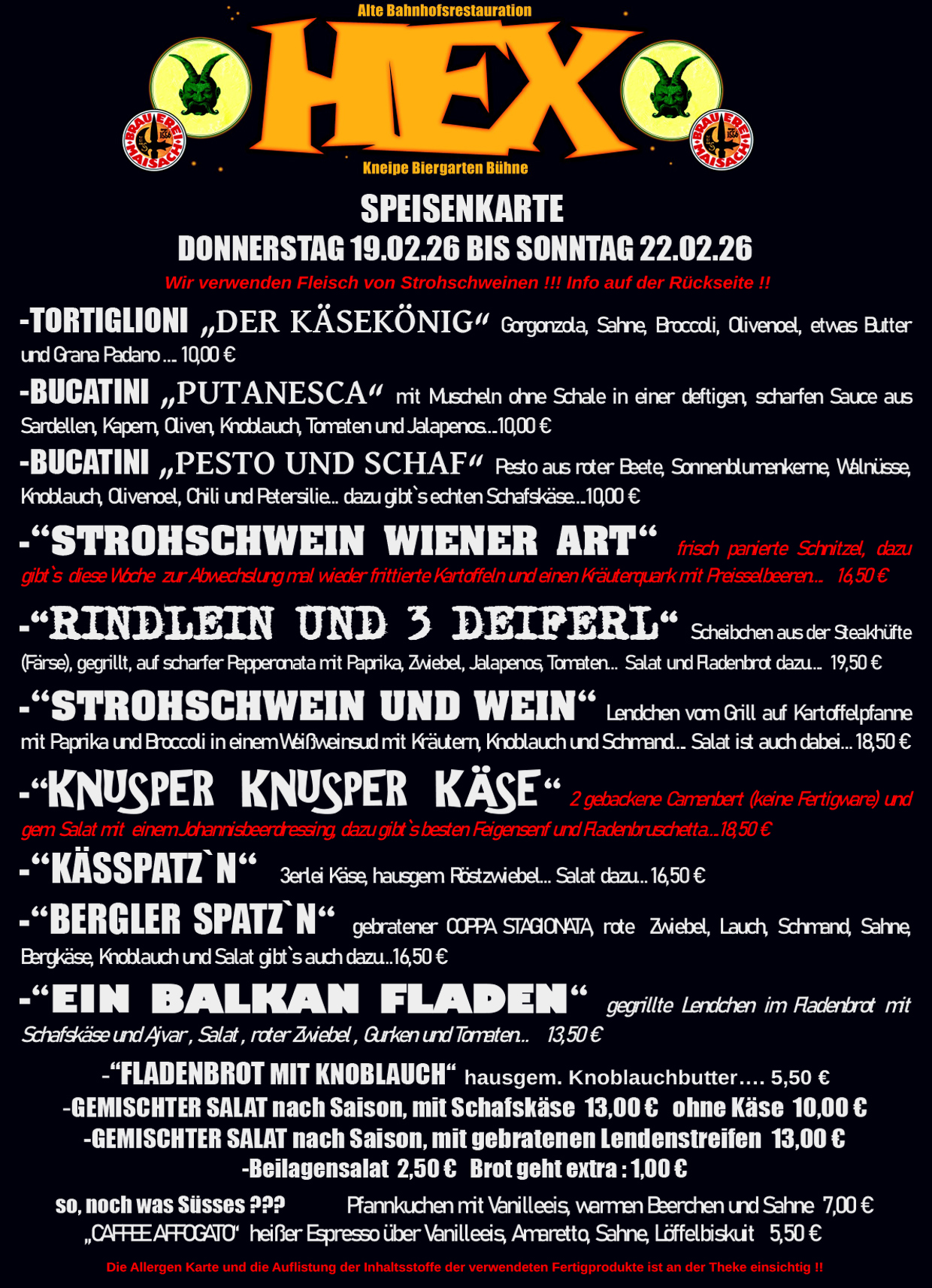 AUßERDEM KEIN FACEBOOK, KEIN X, KEIN TIKTOK, KEIN WHAT`S APP, KEIN INSTA….UND DIE HEX IST KEIN RESTAURANT, SONDERN „NUR“ EINE KNEIPE, IN DER GANZ ORDENTLICH GEKOCHT WIRD…UND „BLOß SCHNELL WAS ESSEN“ GEHT GAR NICHT…NOCH WAS ?? JO, ROCK`N`ROLL BABY….